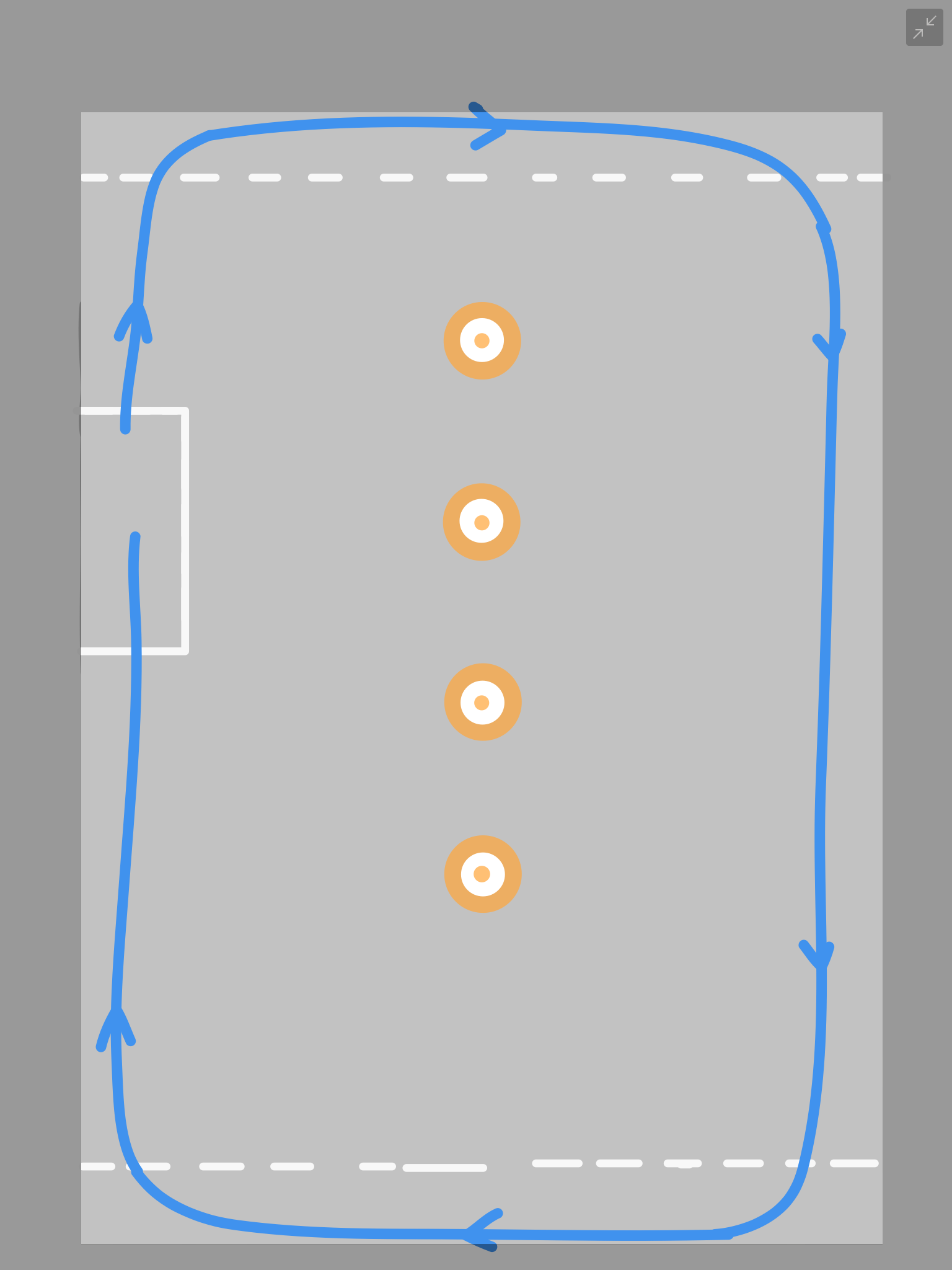 第二部份係喺頂部轉左彎,落斜,兜兩個雪糕筒,靠左,喺底部轉右彎上斜,兜兩個雪糕筒上頂部,向左轉。